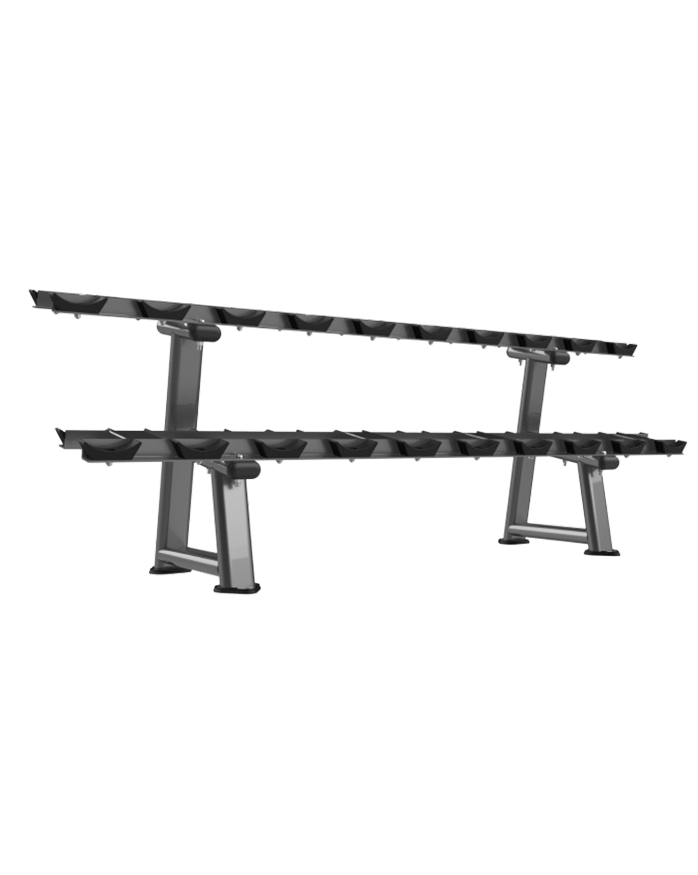 FW-1015 Dumbbell Double-Rack är ett tvåplans hantelställ i kommersiell kvalitet från Real Leader, idealiskt för organiserad och säker förvaring av hantlar i gymmiljöer. Det eleganta och stabila stället rymmer flera hantelpar med skyddande gummihyllor för att minska slitage och ljud.